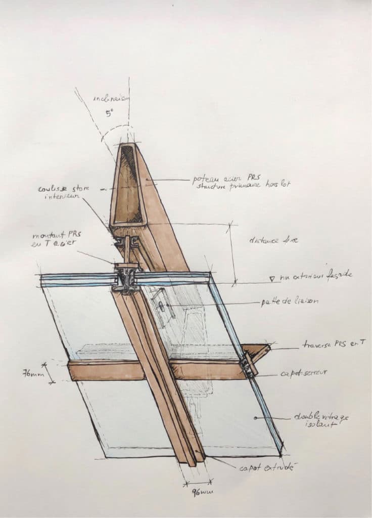 Principe d’attache des montants de façade sur les poteaux en acier et de jonction entre ces montants et les traverses.