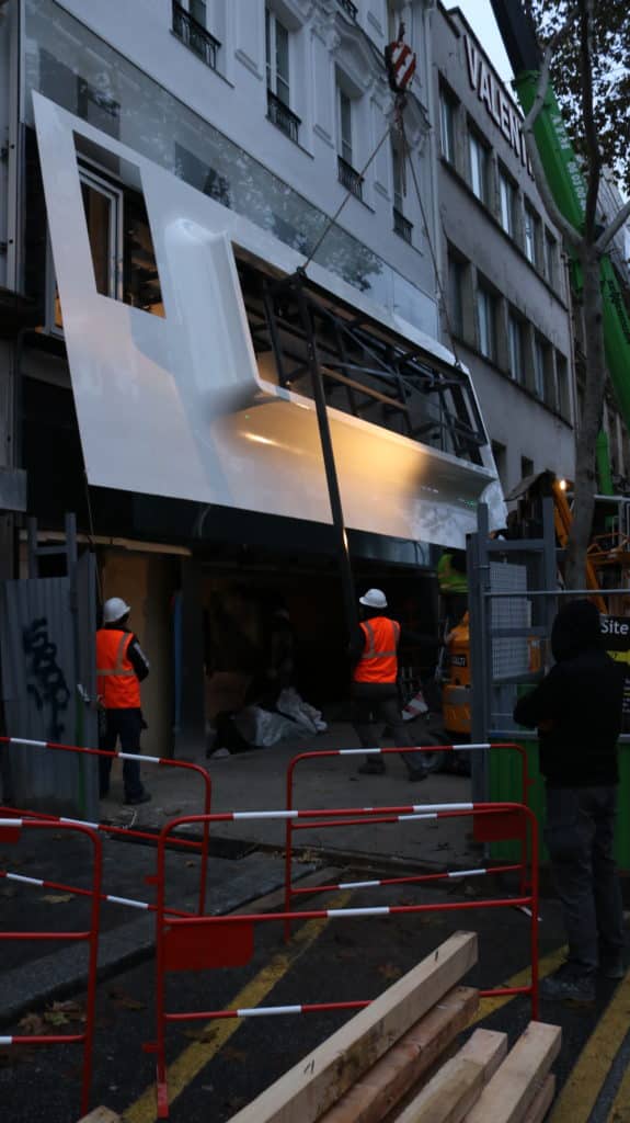 Réhabilitation d’un cinéma de 4 salles et ravalement de la façade, situé avenue de Clichy à Paris. Mise en œuvre d’une coque monolithique de 40 m² à base de composite en fibres de lin. La coque enveloppe la façade et encadre un écran LED. Elle se retourne selon une forme libre pour épouser la façade existante. Façades vitrées lisses en RDC et R+1.