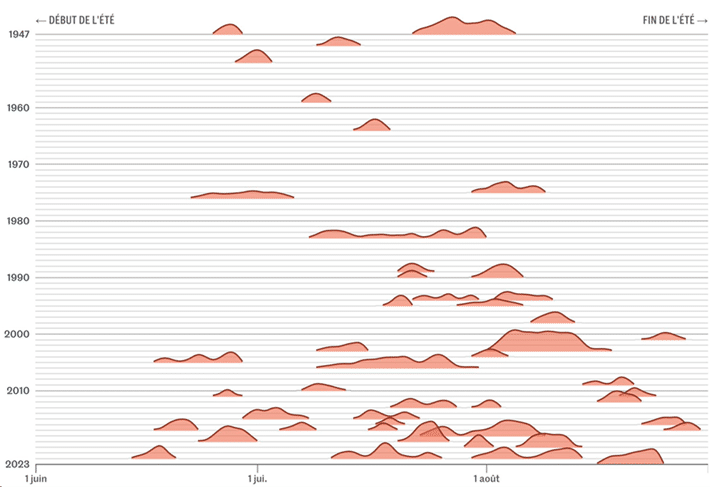 Répartition dans l’été des vagues de chaleur recensées en France métropolitaine depuis 1947. Les courbes représentent la température moyenne quotidienne en France dépassant le seuil de 23,4 °C.