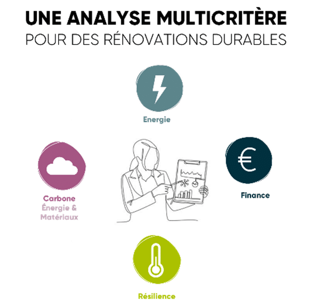 Pour les rénovations de bâtiments existants pour lesquels il existe une volonté d’aller plus loin sur les sujets de confort d’été, de réduction des consommations énergétiques, et de rapport entre impact carbone et coûts des travaux, nous proposons un format d’audit multicritère permettant de traiter l’ensemble de ces thématiques simultanément. Basé sur les principes d’un audit classique avec la construction d’un modèle thermique dynamique représentatif du bâtiment, nous intégrons des variations liées aux actions d’amélioration des performances afin de quantifier les interactions entre performance énergétique, économique, carbone (comptabilisation des émissions évitées par rapport aux émissions induites par les travaux) et confort des occupants (nombre d’heures d’inconfort selon la méthodologie du confort adaptatif). Ces indicateurs sur l’ensemble de ces thématiques permettent d’obtenir une vision élargie et ainsi de mieux guider les arbitrages réalisés au moment de la rénovation.