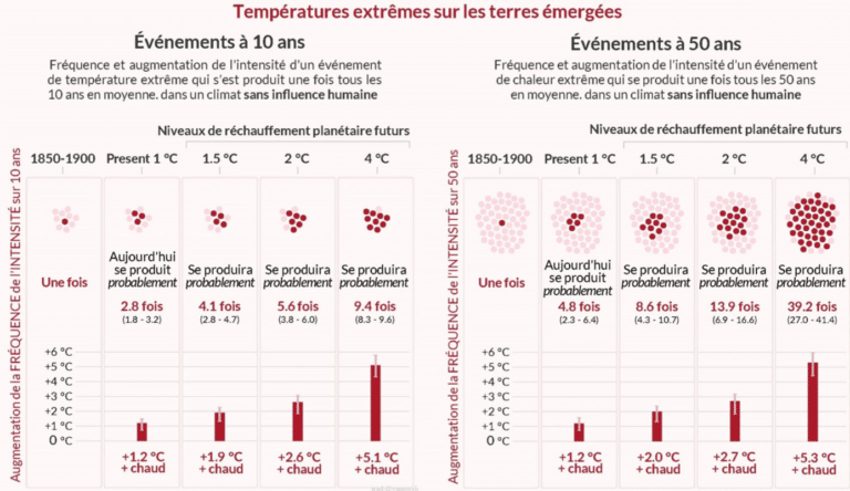 À titre d’exemple, en France, les données montrent que les vagues de chaleur augmentent à la fois en fréquence, en intensité et en durée. En effet, Selon Météo France, alors que la France connaissait en moyenne 1,7 jour de vagues de chaleur par an avant 1989, elle en a subi 7,95 jours par an depuis 2000 et 9,4 sur la dernière décennie. Dans un scénario à +4°, les vagues de chaleur en Ile-de-France s’étendraient de 21 à 94 jours contre 7 aujourd’hui.
