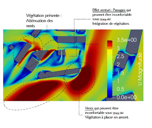 Pour anticiper le comportement du vent sur un projet, nous réalisons parfois en complément une étude de CFD (Computational Fluid Dynamic) externe afin d’approfondir l’analyse de la propagation des vents autour du projet et d’identifier les phénomènes dangereux ou au contraire bénéfiques pour le confort des usagers. L’étude CFD permet notamment d’évaluer les risques d’inconforts liés aux effets Venturi (accélération de l’air dans des passages resserrés, créant des perturbations localisées), ou de “downwash” (effet de “souffle” vertical, qui se produit lorsque le vent frappe la façade de grands bâtiments et est dévié vers le bas, créant de fortes rafales descendantes au niveau du sol).