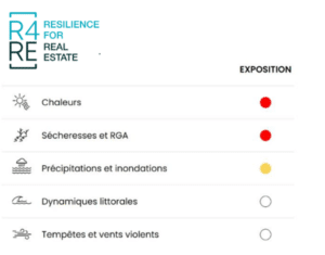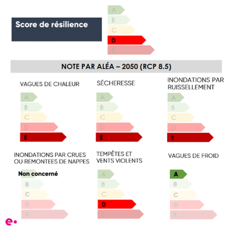 C’est pourquoi Elioth a développé sa propre méthode de diagnostic de performance résilience (DPR) permettant d’évaluer finement le niveau de résilience de projets ou de bâtiments existants et de dégager les actions adaptatives les plus pertinentes pour réduire leur vulnérabilité actuelle et future. Cette méthode croise l’analyse de l’exposition climatique du site étudié, c’est-à-dire l’évolution à venir des aléas dans la zone, étudiée via une analyse géographique et climatique du site, avec la vulnérabilité du bâtiment à ces aléas, c’est-à-dire la propension du site et de ses usagers à subir des dégâts lors de l’aléa, déterminée sur la base d’une visite de site (pour les ouvrages existants) et d’une analyse des plans de travaux & documents de conception (pour les projets). Une fois le niveau de risque défini pour chaque aléa climatique, ce diagnostic permet de formaliser des préconisations opérationnelles et pédagogiques, fondées sur des données empiriques, et permettant d’embarquer l’ensemble des parties prenantes du projet. A l’instar du DPE qui classe les bâtiments selon leur performance énergétique, la méthode DPR d’Elioth permet de classer les bâtiments selon leur niveau de résilience face aux aléas climatiques. Elle permet ainsi de situer le niveau de risque du site, et de le comparer à d’autres actifs. Si elle est réalisée dans le cadre de l’analyse d’un portefeuille immobilier, cette analyse permet de hiérarchiser les bâtiments les plus à risques, sur lesquels le déploiement d’actions adaptatives est prioritaire, et ainsi rationaliser l’action de l’entreprise en matière de résilience