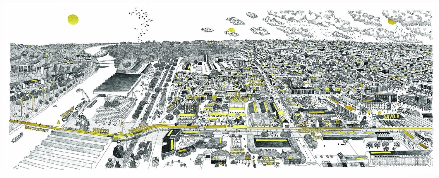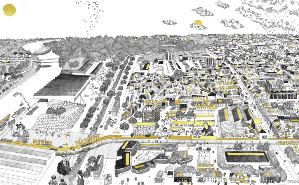 Notre projet s’appuie sur le concept de fabrique (réintégration de la production en ville au service de la ville) et l’idée d’un système urbain ouvert, adaptable sans cesse. Le scénario prospectif développe un principe de reconquête urbaine avec plusieurs idées intéressantes et « futuristes »