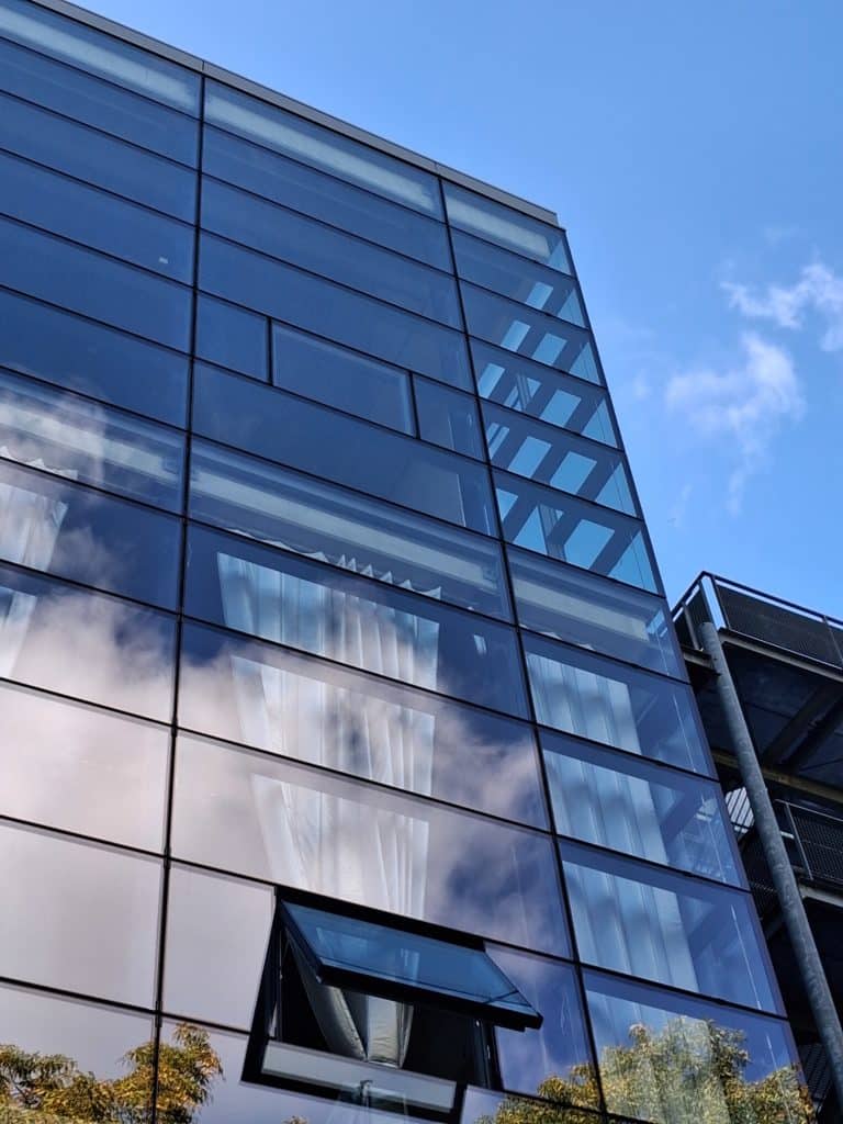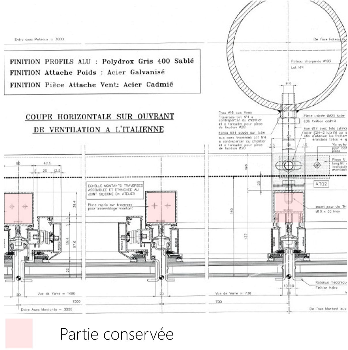 Il a été choisi de conserver les montants de l’ossature primaire existante permettant plusieurs gains considérables : la conservation a permis de réaliser le remplacement de la façade en 2 mois de chantier pendant les congés d’été, la trame de façade étant déjà en place et a également permis d’économiser un montant important par rapport à un remplacement complet et a permis un bilan carbone réduit. Le remplacement des traverses a été nécessaire compte tenu des désordres constatés et un nouvel assemblages montants traverses a été imaginé. Un avis de chantier a été fait pour valider la solution.