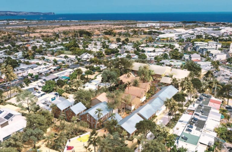 The Ariste Bolon School consists of a kindergarten and a primary school designed as wooden-frame cabins on two levels (G+1), set within a green and cool landscaped island.