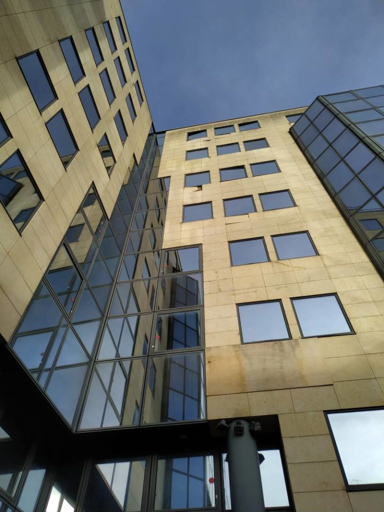 Office building from 1989 enclosed between two squares. The facades are completely replaced to improve the transparency and performance of the envelope, with an architectural concern for homogeneity: the omnipresent glass is sometimes transparent, sometimes opaque to meet interior uses and solar constraints.