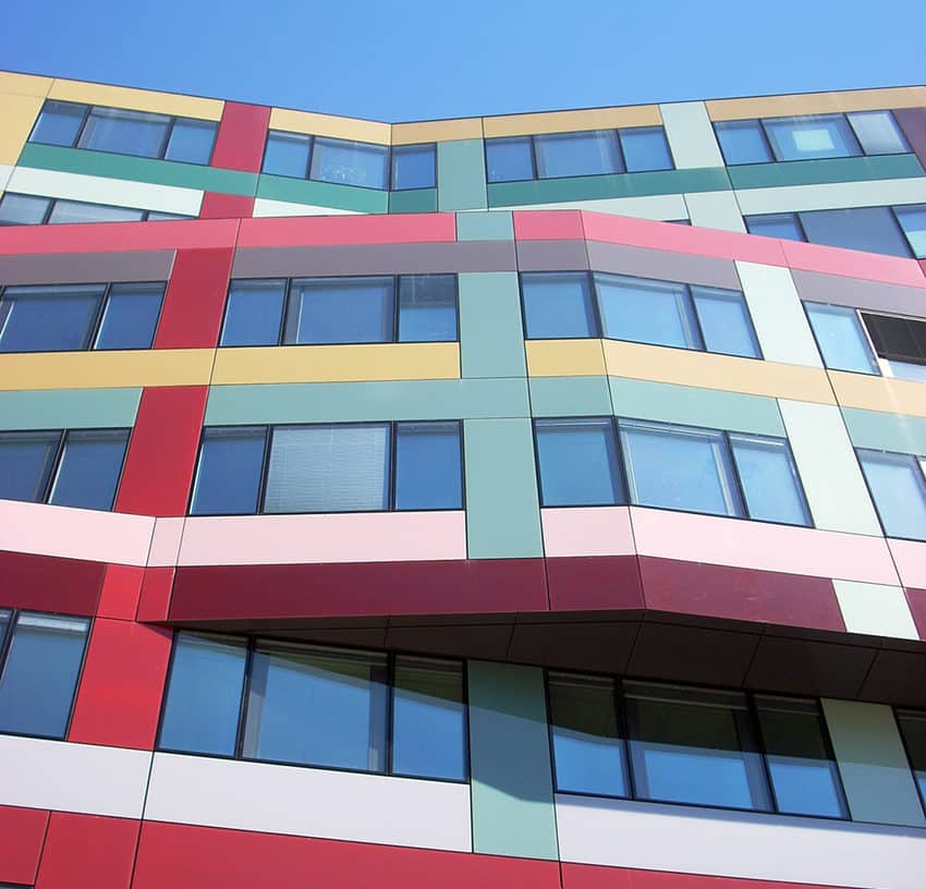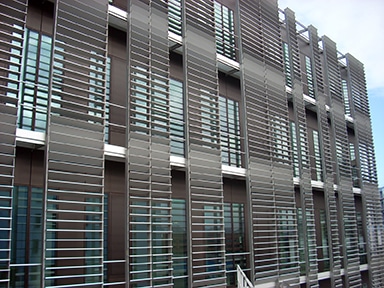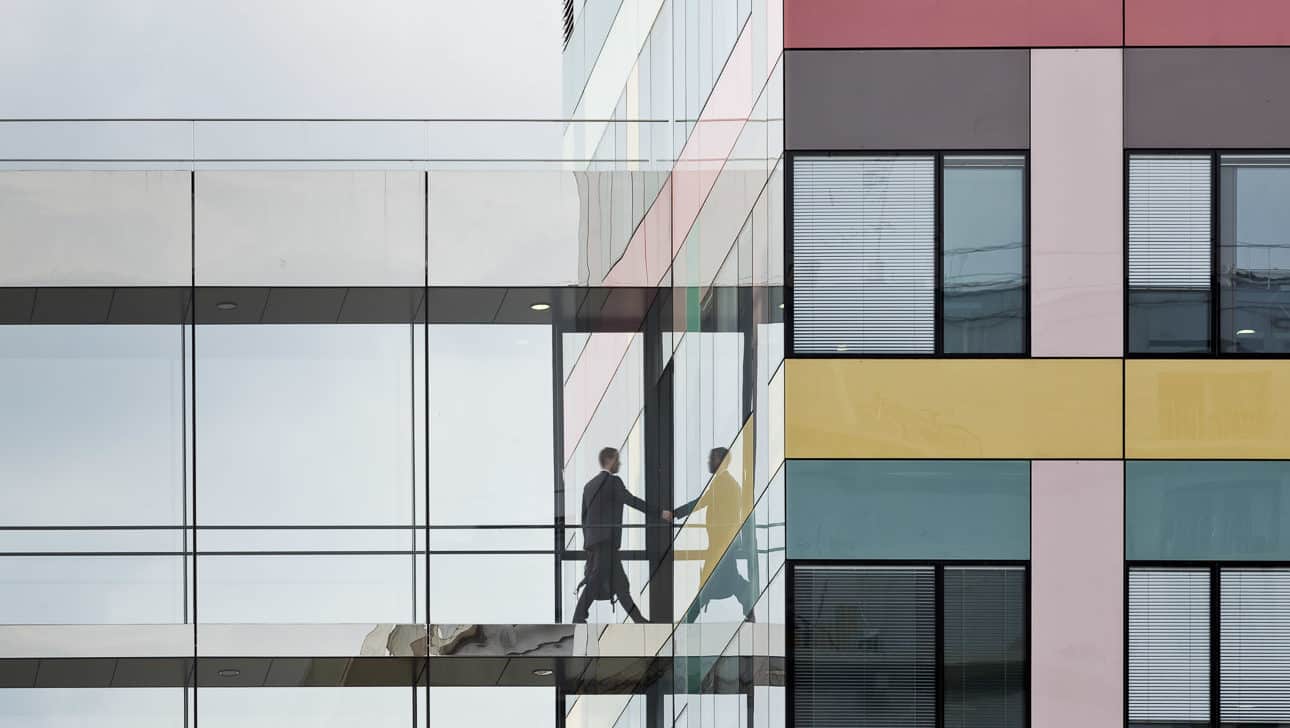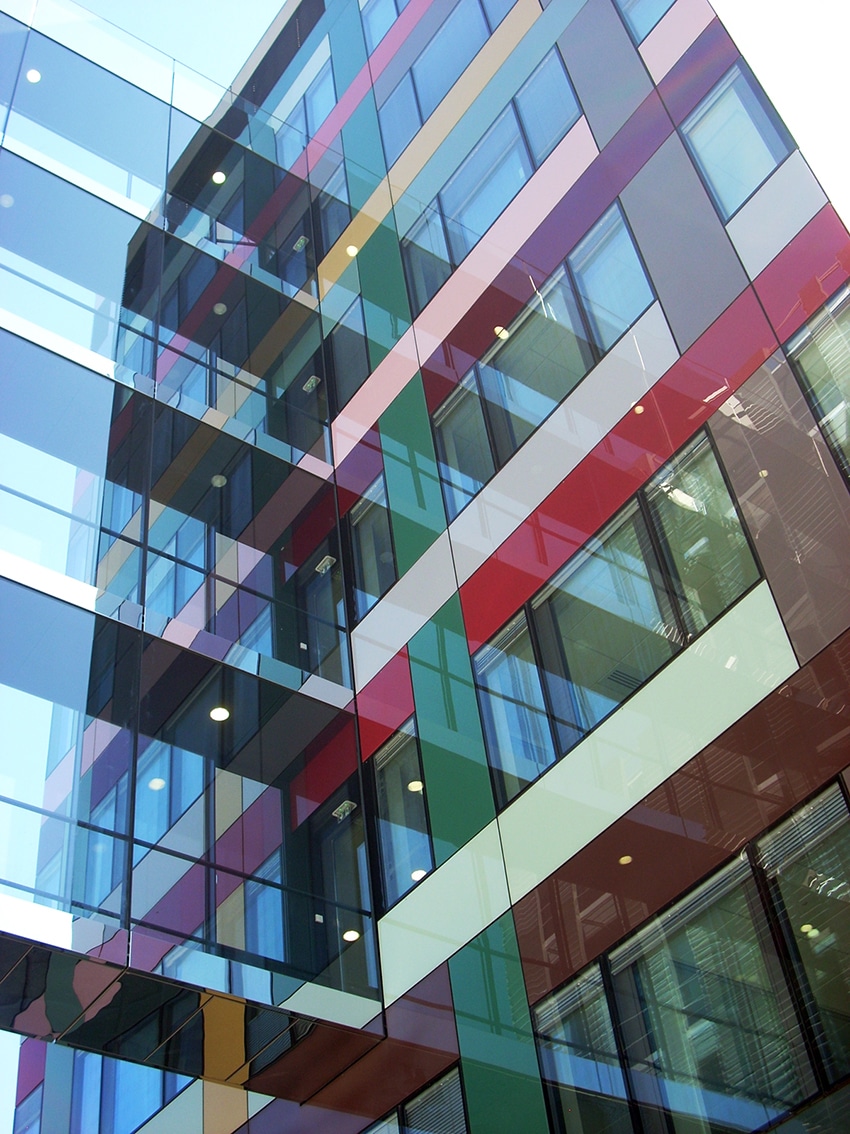 The A2 building incorporates large enamelled glass fills and hidden sash frames. The façade incorporates movable external sun protection. Building B2 has a double façade on the South, East and West exhibitions. The exterior “skin” is achieved by inclined sunshades designed for optimal management of solar and luminous contributions. A technical passage is arranged between the two facades to allow easy maintenance of the surfaces.
