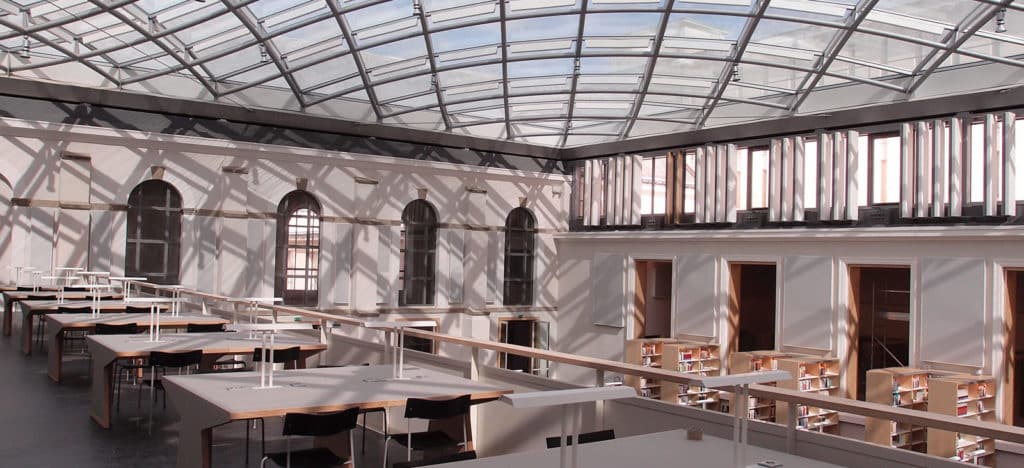 Since 2012, the glass roof of the Rennes’ University Library protects and welcomes new readers. The renovation of the town of Rennes’ old university library gave a perfect opportuntiy to ELIOTH to show the full range of its expertise.  The project signed by the architect, Bruno Gaudin, covered issues which dealt with structural engineering, façades and environment. The challenge that represents the modernizing of an existing building to optimize its performance all the while preserving its pervading spirit « genius loci », finally led us to designing a courtyard covered by a glass arch. Like a blown transparent membrane, the glass roof symbolizes the osmotic relationship with the town. The geometry of the arch strives to interrelate the work of architecture with structural and energy efficiency. Thus, its form is the result of a research process to obtain high structural efficiency.