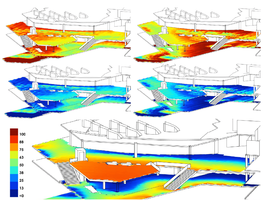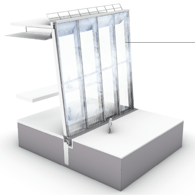 Natural lighting is provided by the entirely glazed facade, accompanied by additional light from a skylight on the roof. The light is controlled by high-performance interior blinds automatically deployed on each facade according to the amount of sunlight and the external temperature. A system of natural ventilation in the corridors, doors and at the foot of the facade also helps to control temperature.