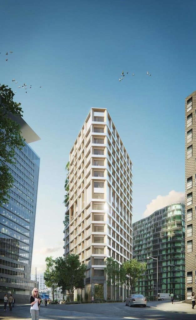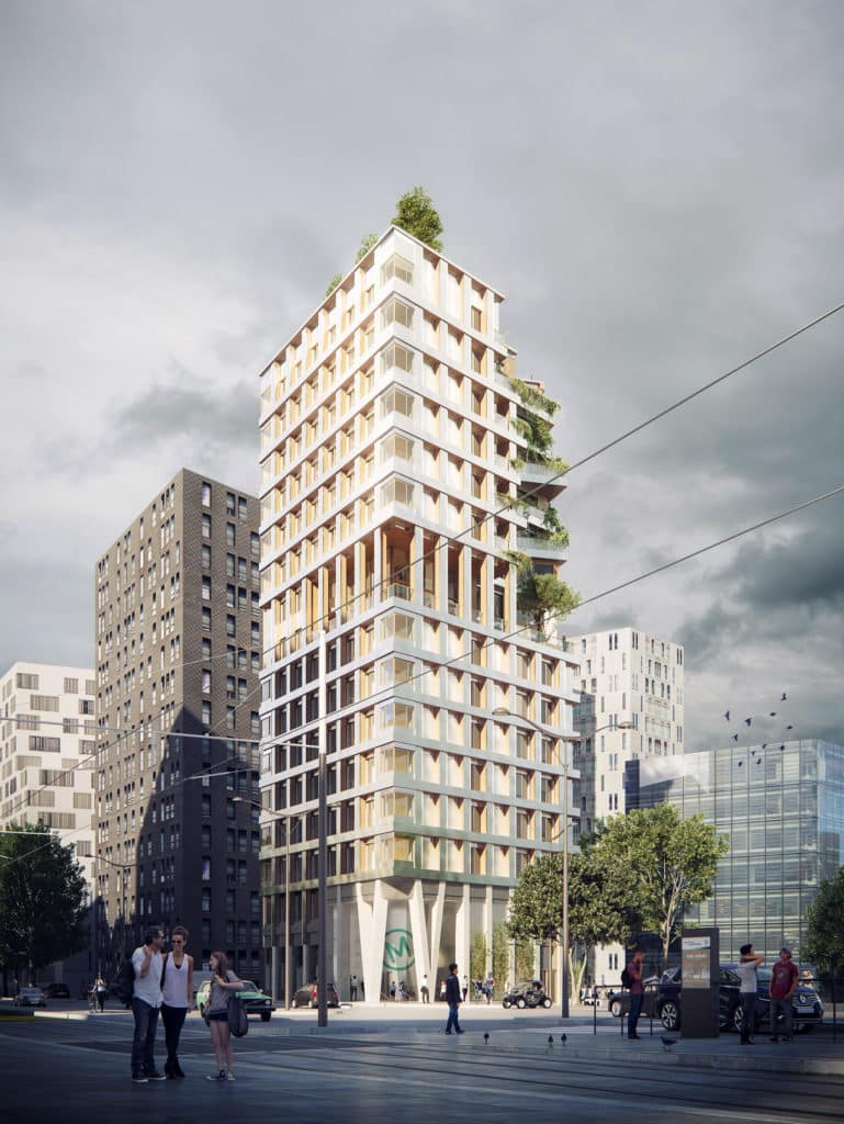 This 15-storey student housing tower (G+15) features a hybrid wood–steel–concrete structural system with extensive use of timber floors. Its envelope consists of timber-framed façades.