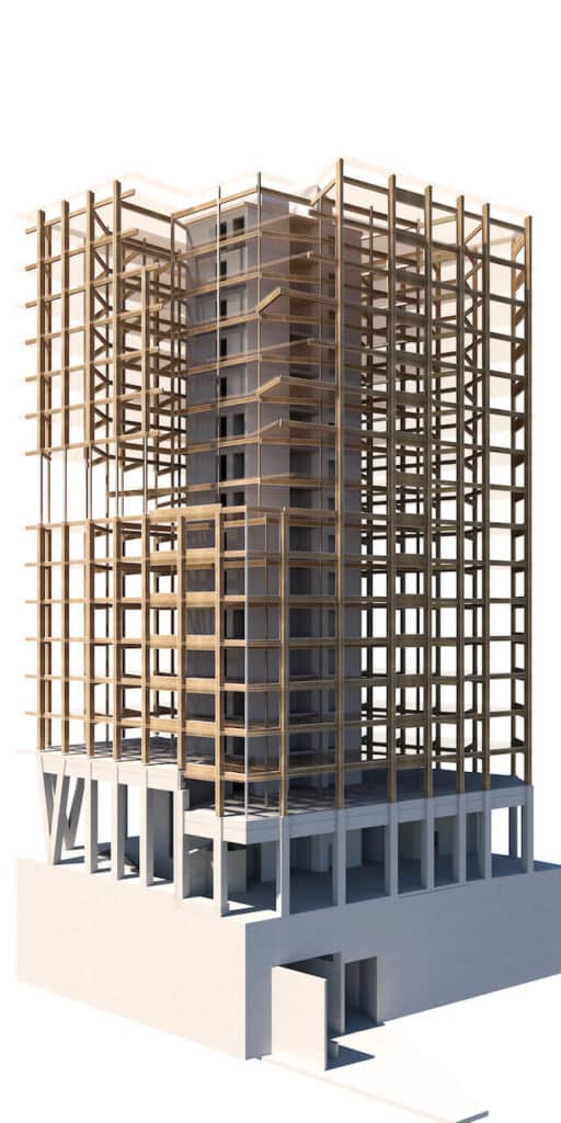 The tower is braced by a concrete core, with a reinforced concrete load-bearing structure and timber floor slabs.