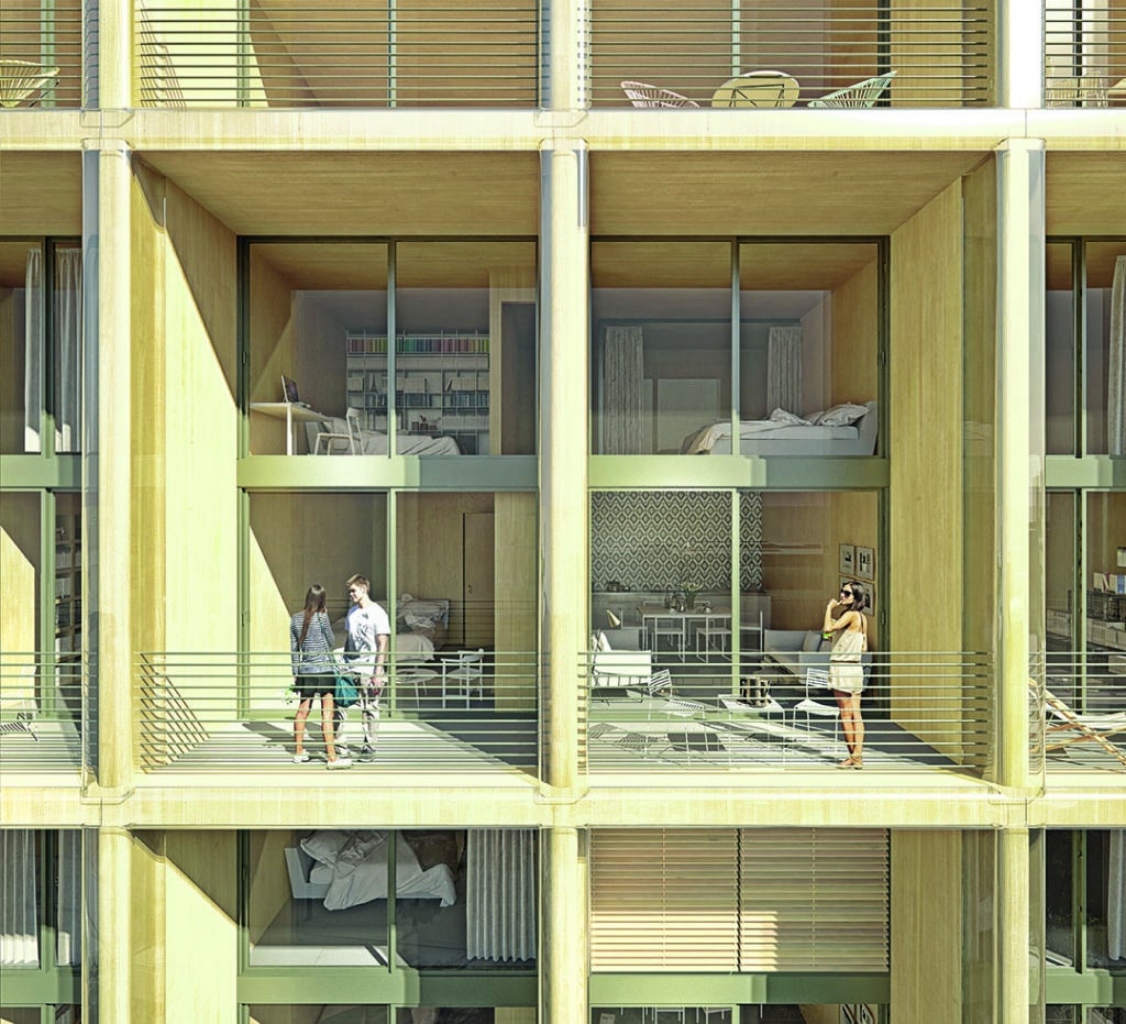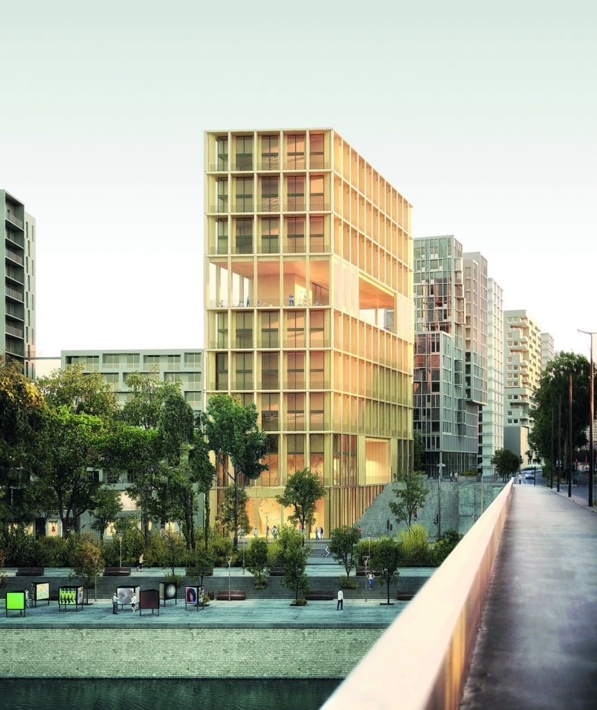 The project is a 17-floor student accommodation building with a structure made entirely of wood, situated on the banks of the river Seine and close to the Boulevard Périphérique. On this project, the aspect of ‘demonstrating wood’ has been respected to the letter: wood can be found and is visible everywhere. The position of the structure, built as an exoskeleton, requires the careful management of structural systems and junctions between interior and exterior; the design of the envelope must therefore deliver a required acoustic and energy performance which is achieved through the permanent dialogue between our three areas of expertise: Structure, Façade and Environment.