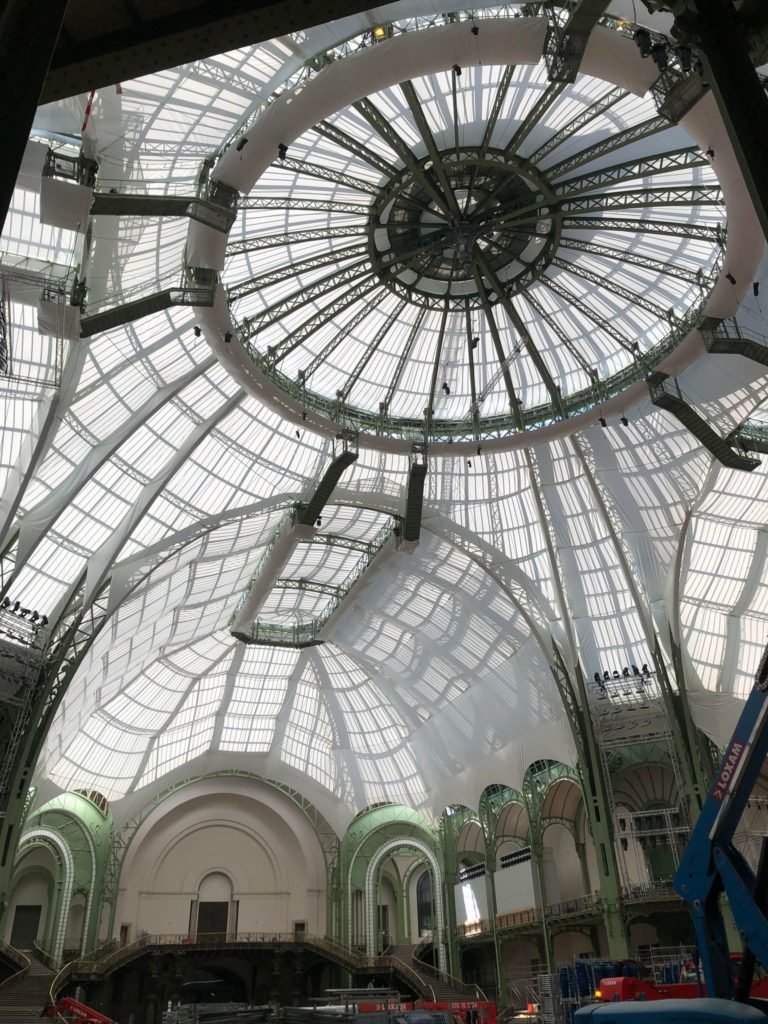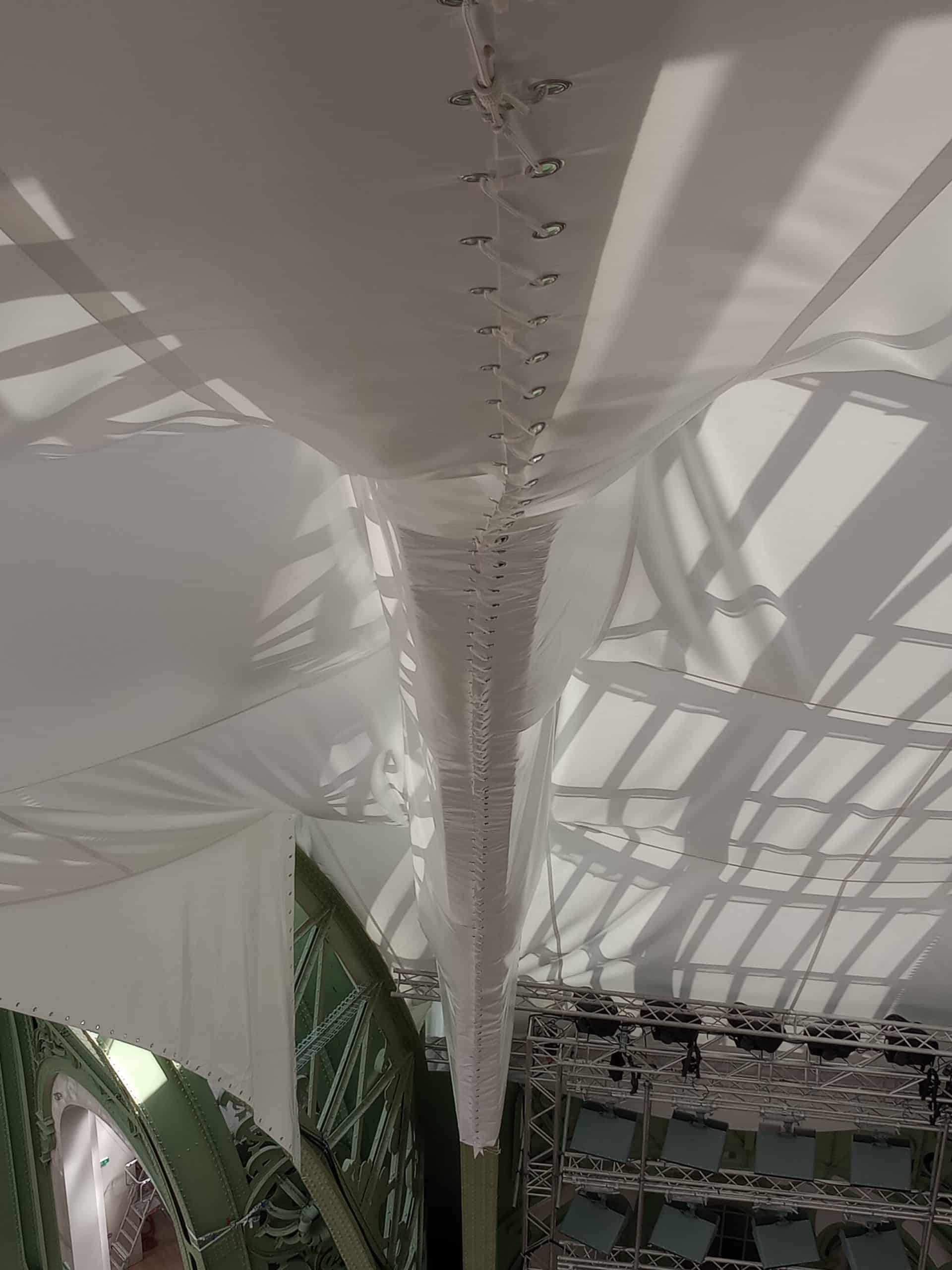 Le projet devait également répondre à des contraintes de planning strictes : les voiles devaient être rapidement montables et démontables selon les périodes d’accès au Grand Palais, tout en respectant les délais de fabrication et de production des matériaux.