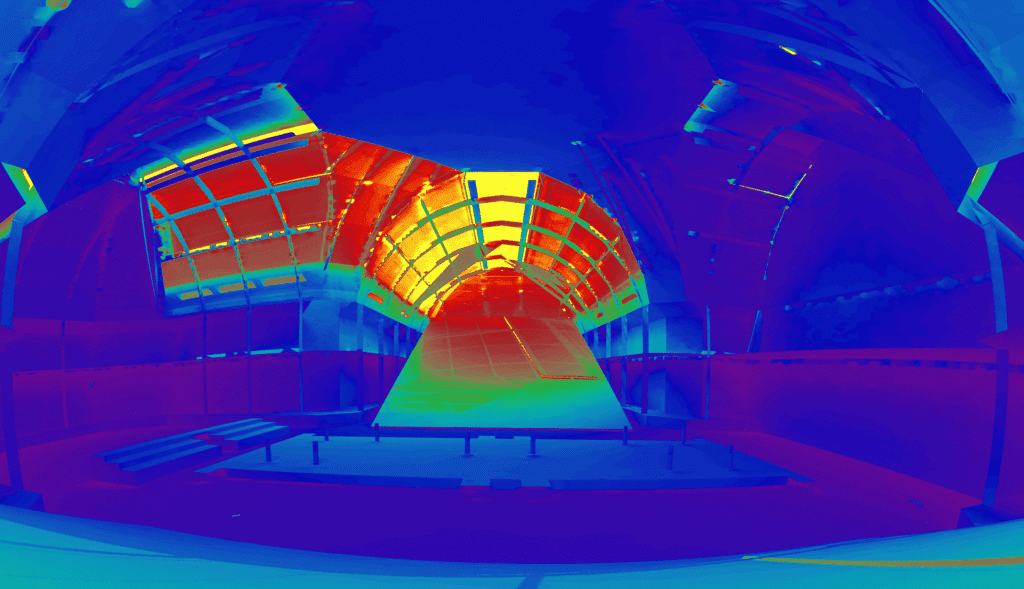 - Des vues panoramiques en Luminance, issues de simulations, depuis des points d’intérêts (identifiés comme des caméras) à l’intérieur de l’espace, permettant de qualifier l’ambiance lumineuse en lumière naturelle qui serait perçue par une caméra.