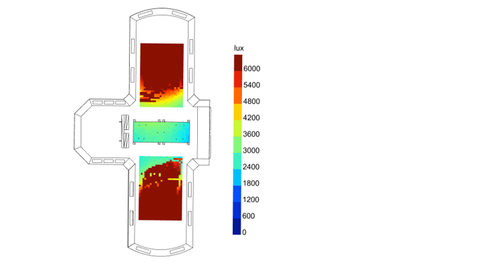 - Des cartographies d’éclairement à des heures ponctuelles d’une journée caractéristique, permettant d’évaluer les niveaux de contraste en lumière naturelle et de servir de base pour les futurs dimensionnements de l’éclairage artificiel.