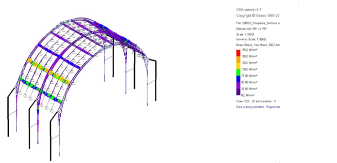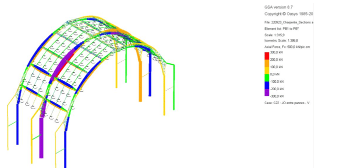 Le projet étant une structure temporaire pendant la période des jeux olympiques, une réduction des charges de vent et de neige a été prise en compte conformément aux dispositions prévues par les Eurocodes. La descente de charges associée au occultations rapportées a été justifiée via une analyse comparative des sollicitations transitant dans la charpente existante et des déformées des éléments pour lesquels le risque d’instabilité pourrait être aggravé :