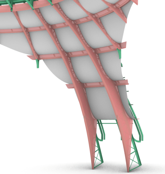 Géométrie de la toile inférieure du dôme (jupe de raccord en rouge) © Elioth