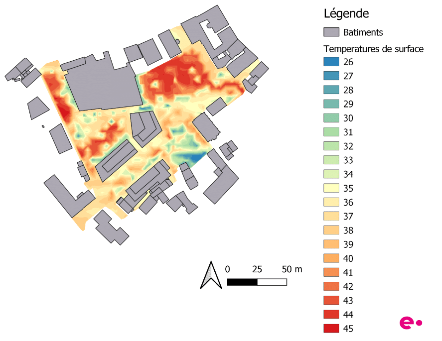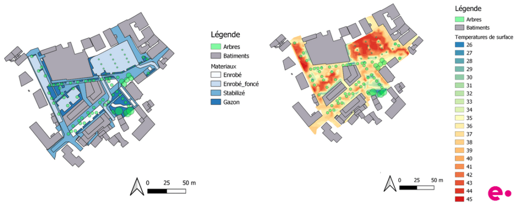 - avec des beaux rendus et des données en température de surface afin de comparer le projet et l’existant ou différentes propositions de projets : cartographie