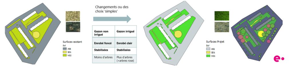 Par exemple ici vous pouvez voir des changements simples sur une place (changer le type d’enrobé, irriguer plus et changer le gazon, et planter plus d’arbres). Avec ce genre d’action, il est possible de voir une amélioration de 2°C dans la moyenne des températures de surface des journées.