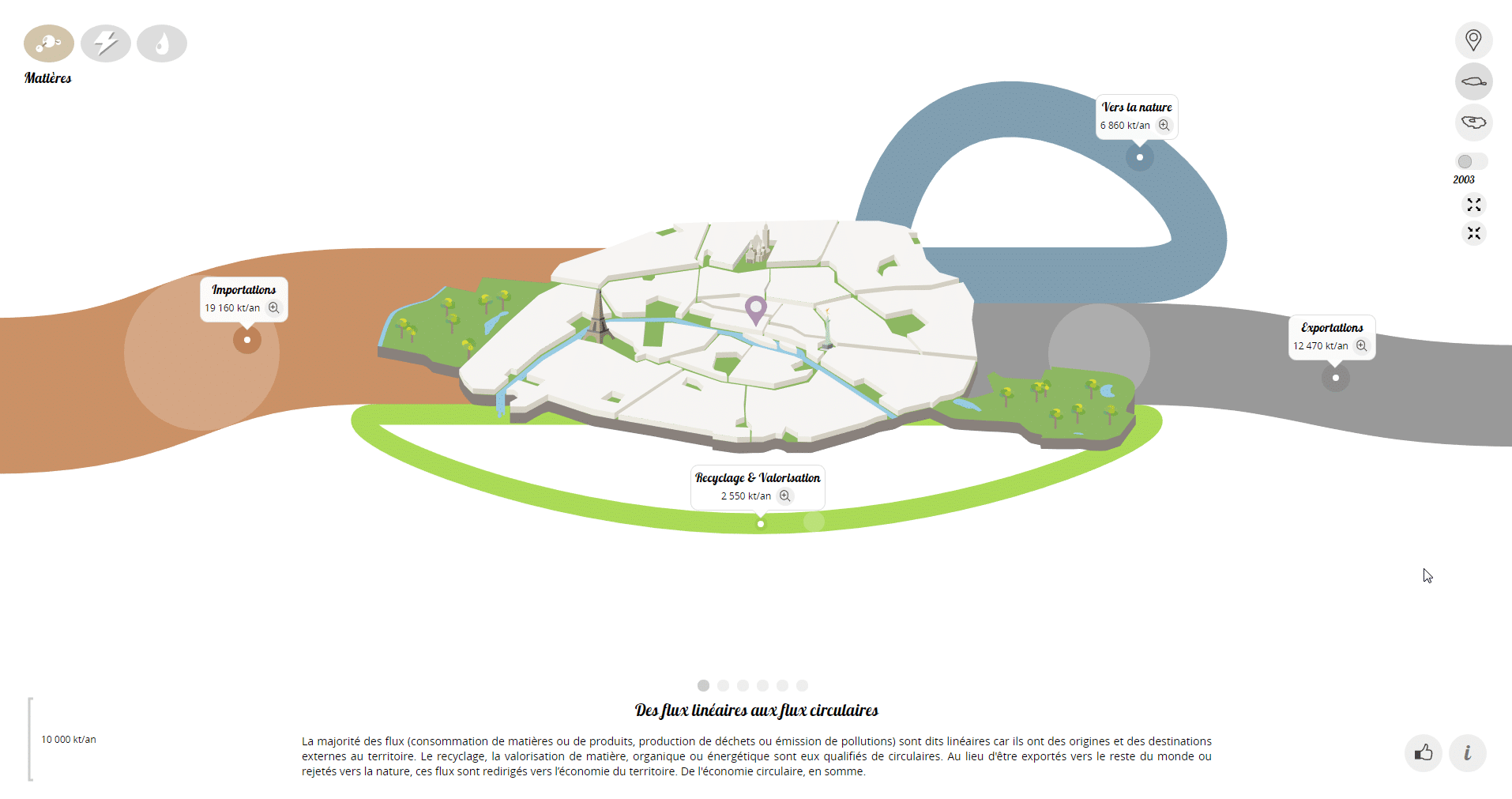Visualisation des données énergies / matières / eaux du métabolisme de Paris, de la Petite Couronne et de l’Ile-de-France, et intégration de contenu « projets innovants ».