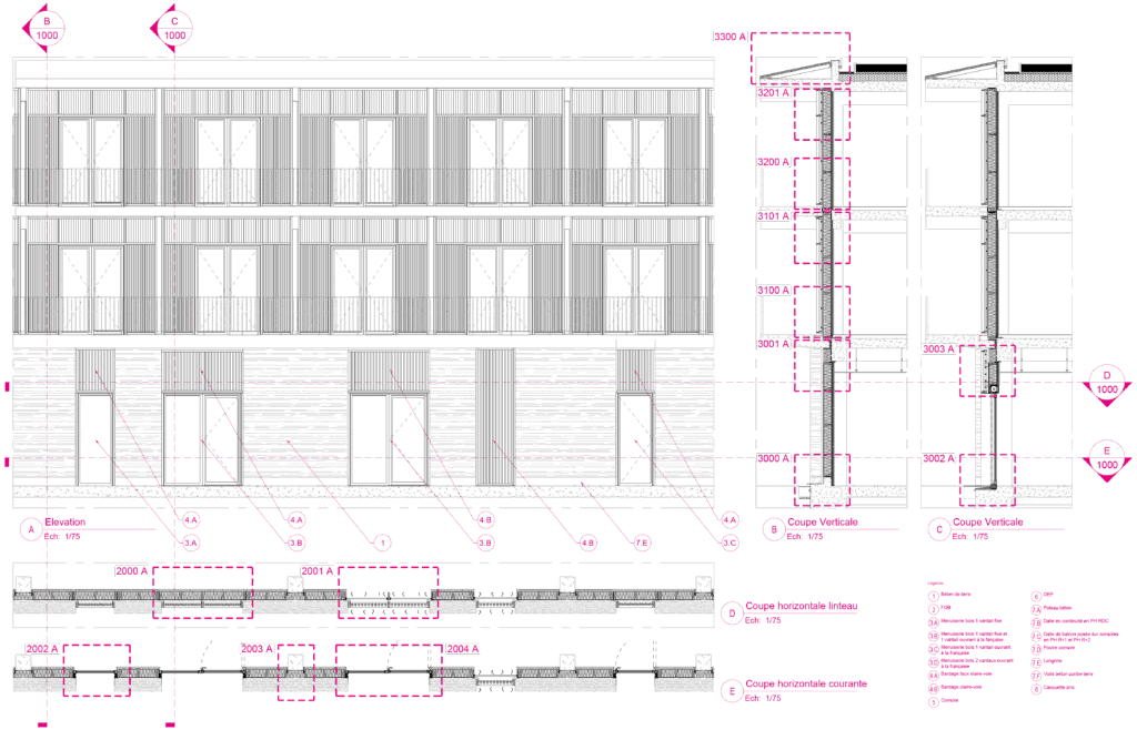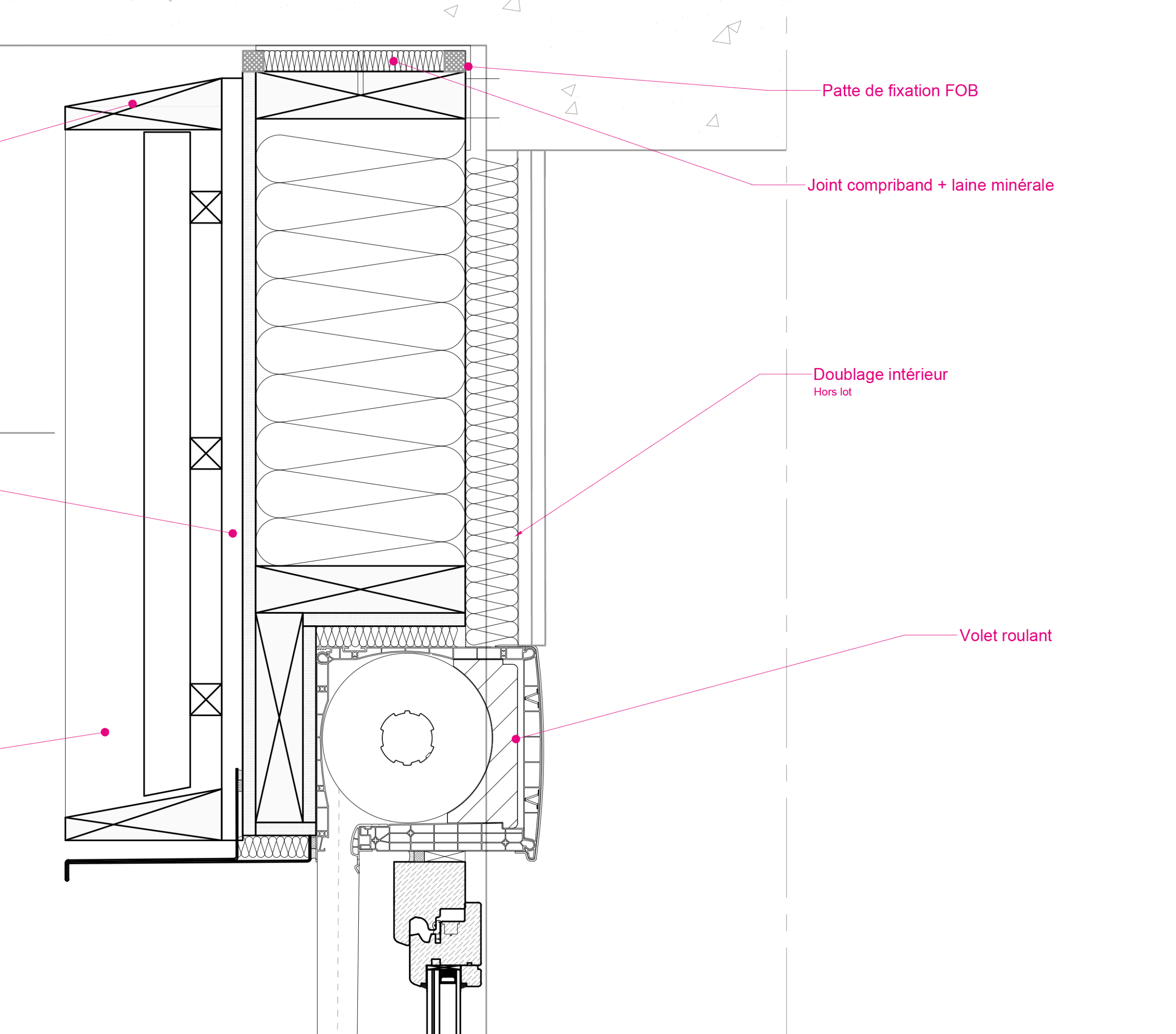 Notre expertise sur ce projet intéresse le lot enveloppe. En RDC est prévue une façade en béton de terre, exploitant des terres de réemploi locales. Dans les étages, une Façade Ossature Bois (FOB) filante supporte un bardage bois et assure l’étanchéité à l’air et à l’eau du bâtiment. Les menuiseries sont prévues en bois.
