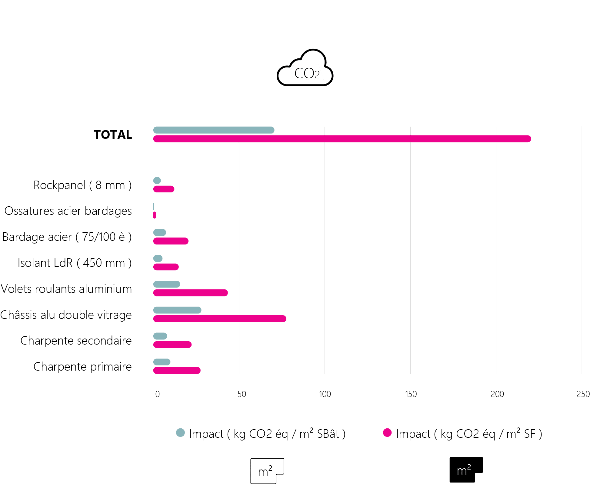 D’après nos données internes, une façade neuve représente en général de 50 kgCO2éq/m²Sbat, pour les façades les plus sobres (structure bois, peu de surface vitrée…) et les bâtiments les plus compactes (ratio de surface de façade / surface de plancher faible), à 150 kgCO2éq/m²Sbat pour les façades les plus complexes (grandes surfaces vitrées, doubles peau vitrées, structures aluminium…) et les bâtiments les moins compactes. De plus, ces valeurs peuvent encore grimper sur les façades particulièrement techniques des hôpitaux (vitrages respirants pour éviter les occultations intérieures, bâtiments peu compactes pour apporter de la lumière dans toutes les chambres et réduire les zones aveugles …).