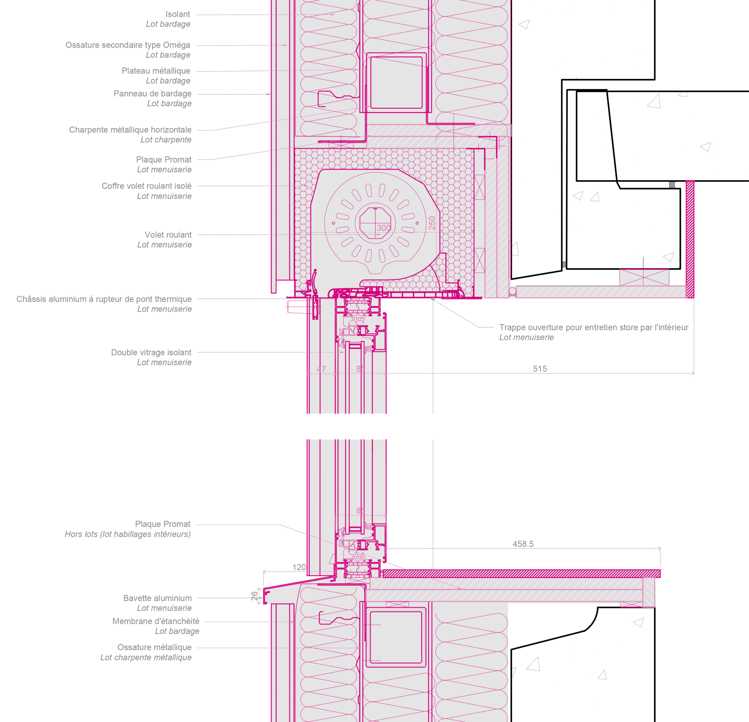 Les façades existantes ont la particularité d’être composées de panneaux béton préfabriqués. Afin de ne pas solliciter ces panneaux, nous avons conçu une façade totalement suspendue en toiture. La façade est donc revêtue d’un exosquelette métallique puis d’une isolation thermique extérieure très performante et de menuiseries aluminium isolantes.