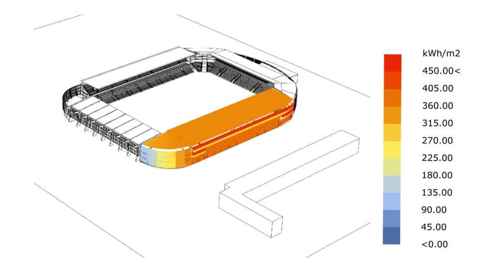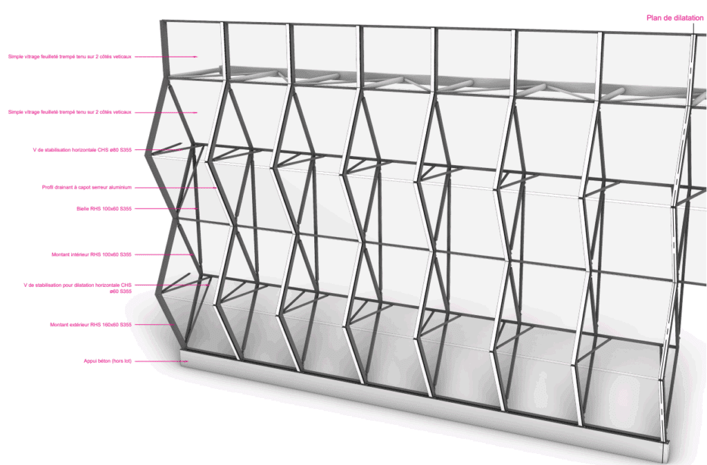 La façade de la nouvelle tribune d’Honneur est voulue légère et à l’impact carbone réduit. Les parties opaques sont des façades à ossature bois bardées de lames de bois. Derrière la tribune, une façade plissée, en simple vitrage, abrite du vent et donne une nouvelle image au stade du Moustoir. Une structure légère, en acier, porte le simple vitrage de la nouvelle façade. La conception et la justification de cette structure de façade se fait de concert avec le développement d’un système de façade vitrée sur mesure.