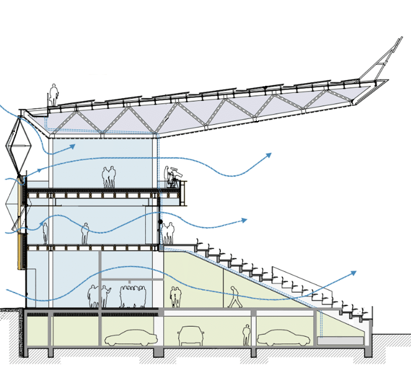 Elioth a conçu la charpente de la serre comme une structure légère qui crée un volume habitable partagé par les résidents, dont la géométrie irrégulière et complexe permet l’introduction d’ouvertures paysagées offrant depuis la rue des perspectives sur la végétation