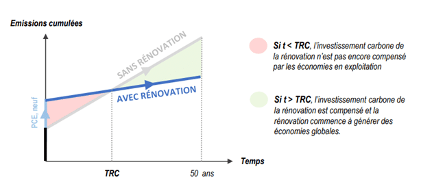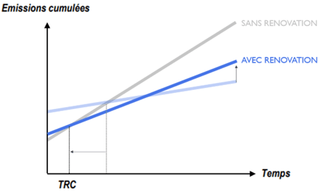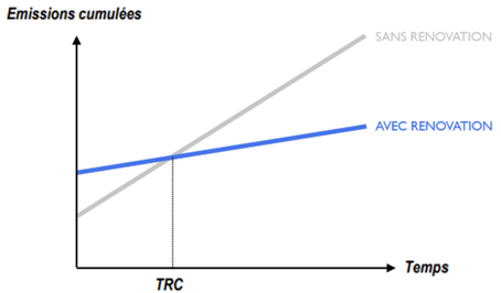 Le TRC est défini comme le nombre d’années à partir duquel l’investissement en carbone embarqué dans le bâti par les travaux (impact carbone des matériaux) a été rentabilisé par la baisse des émissions énergétiques annuelles. Plus un projet aurait un TRC faible, plus il serait rentable d’un point de vue carbone. Cette définition soulève un ensemble de problématiques que nous allons traiter dans cet article :