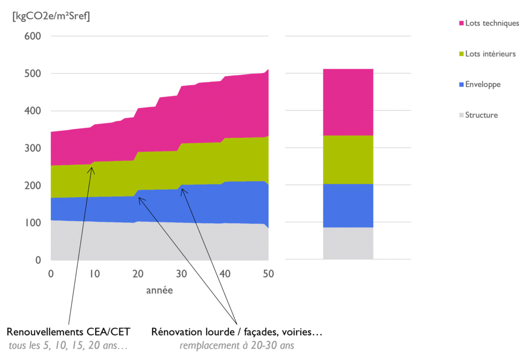 En général, l’impact carbone des matériaux est présenté comme une unique valeur correspondant aux émissions cumulées sur 50 ans. Cette approche cache la répartition temporelle des émissions sur les 50 ans de durée de vie du bâtiment.