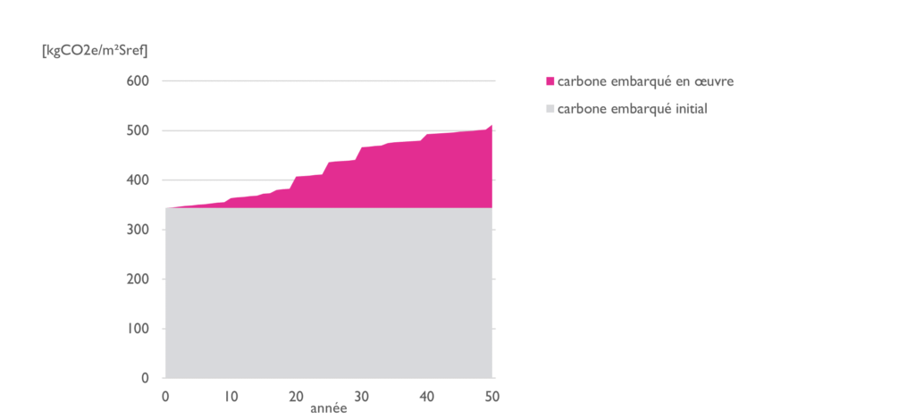 On peut définir la notion de carbone embarqué initial (émissions à l’année 0 en amont de la livraison du bâtiment, correspondant à la notion d’upfront embodied carbon utilisée notamment dans le monde anglo-saxon et les normes de comptabilité carbone sur lesquelles s’appuie par exemple la SBTi) et de carbone embarqué en œuvre (émissions relatives à la vie en œuvre du bâtiment : exploitation et renouvellement sur les 50 ans, correspondant à la notion d’in-use embodied carbon dans le monde anglo-saxon).