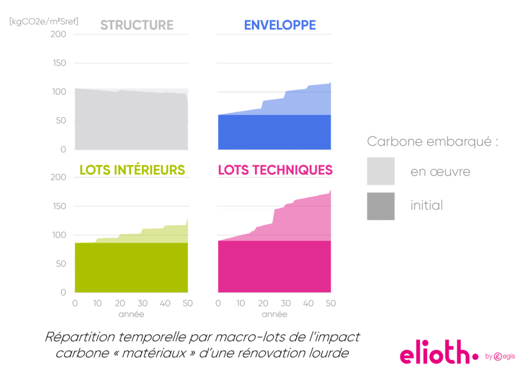 - Il rapporte donc non seulement l’impact carbone des matériaux effectivement mis en œuvre, mais également ceux des rénovations futures, sans les associer elles-mêmes à de nouveaux gains énergétiques.