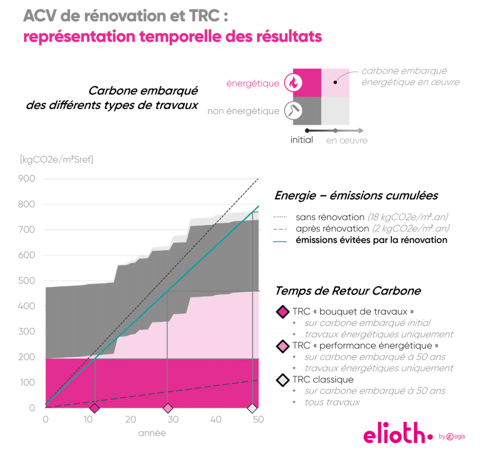 Il n’existe pas à l’heure actuelle de méthode réglementaire et/ou consensuelle de calcul d’ACV pour un projet de rénovation. Définir un cadre méthodologique clair et des indicateurs pertinents pour évaluer une opération de réhabilitation est pourtant un enjeu essentiel sachant que l’objectif de la SNBC est de rénover 500 000 logements chaque année, et jusqu’à 700 000 par an à plus long terme. Pour caractériser l’intérêt d’une rénovation et tenter d’objectiver en phases programmatiques et de conception la pertinence de bouquets de travaux d’ampleurs très variables, l’indicateur du Temps de Retour Carbone (TRC) tend parmi d’autres à se généraliser.