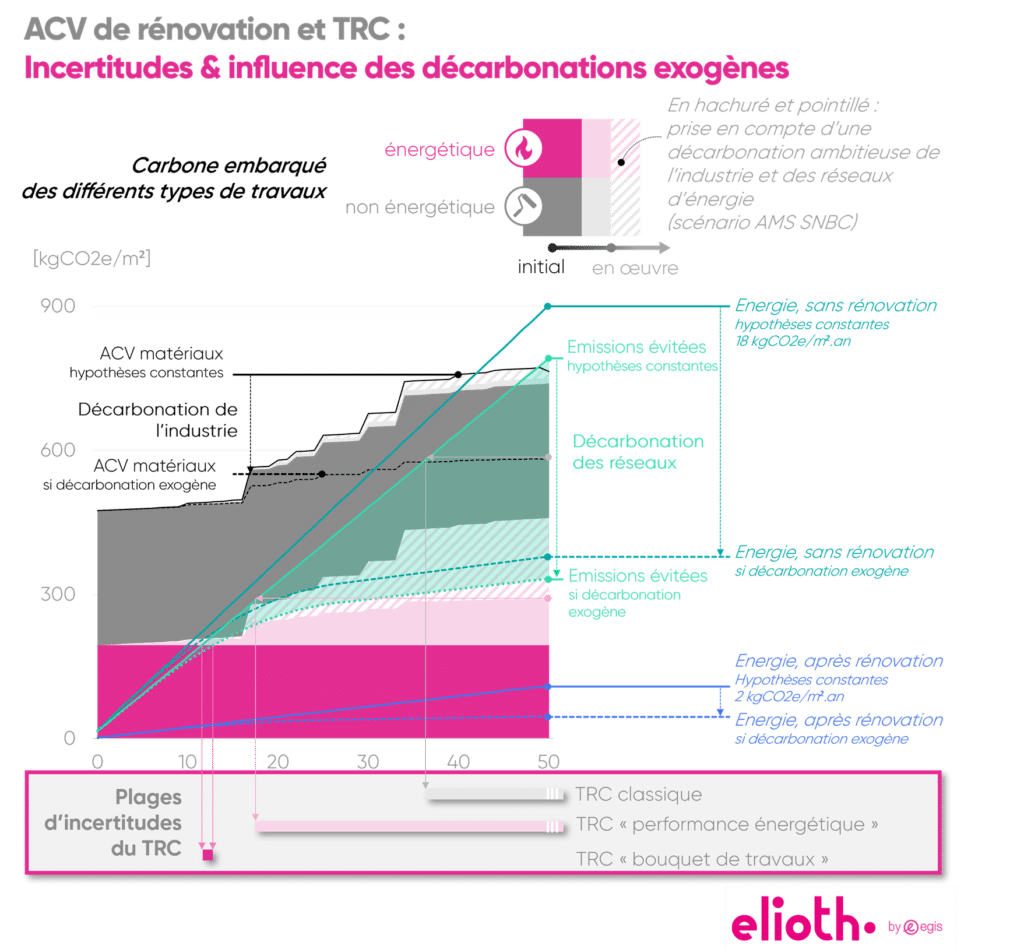 - Il porte par construction une incertitude élevée liée à la vie future du bâtiment rénové, et à la décarbonation attendue des énergies et des filières.